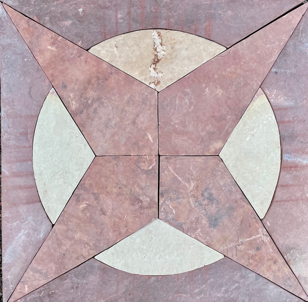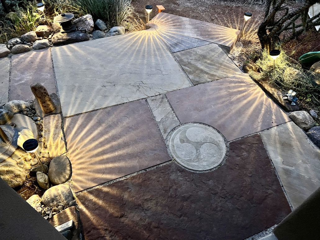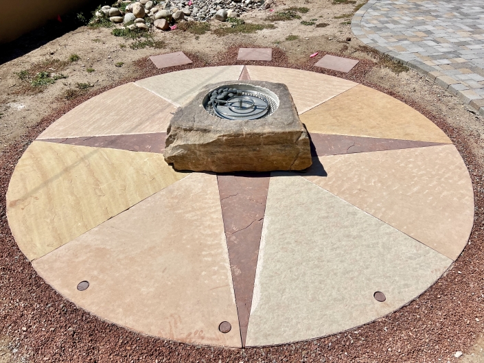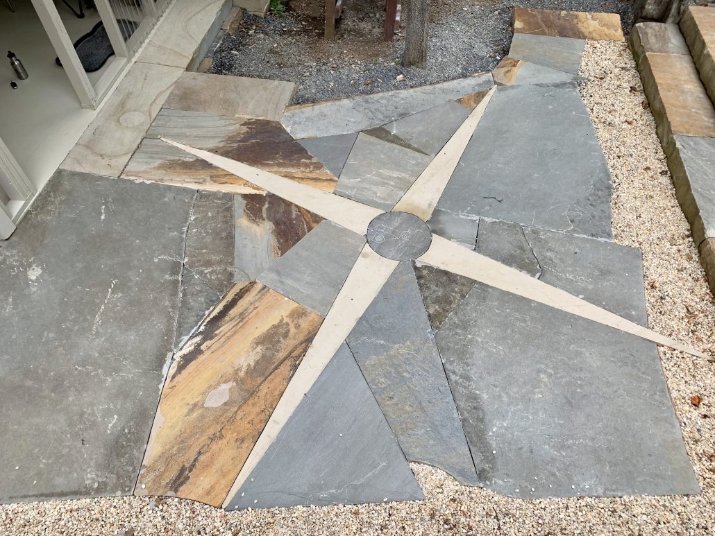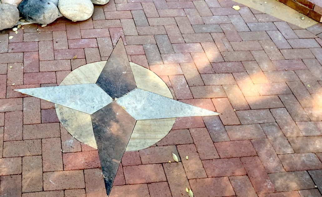 Many of my patios feature the compass rose, showing the 4 cardinal directions. Others also have joinery or other markings which indicate solar and lunar cycle.