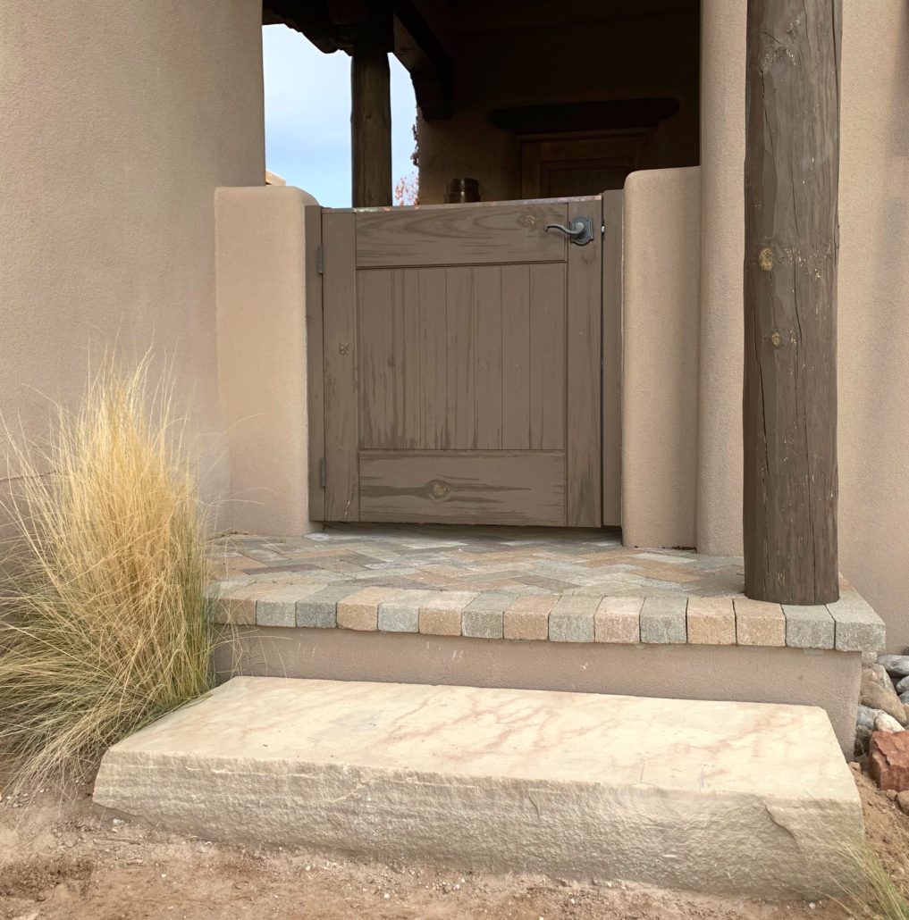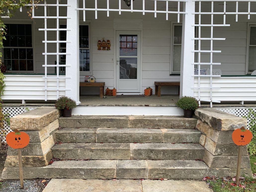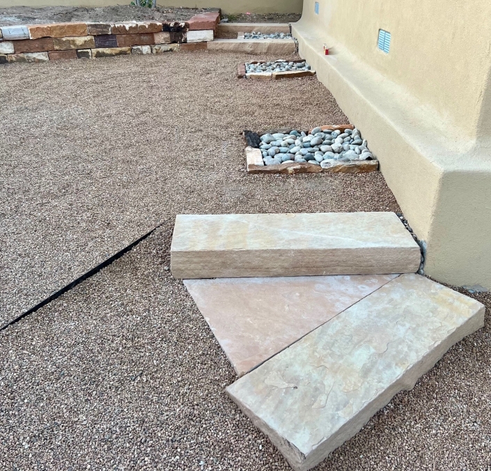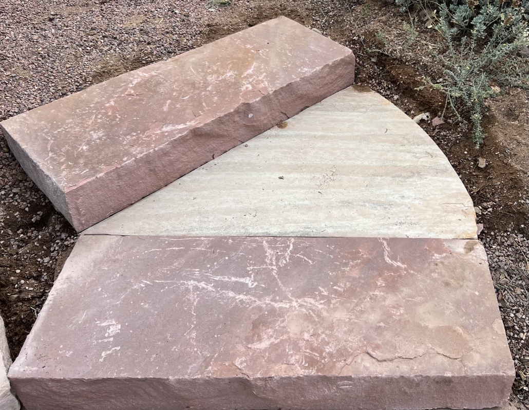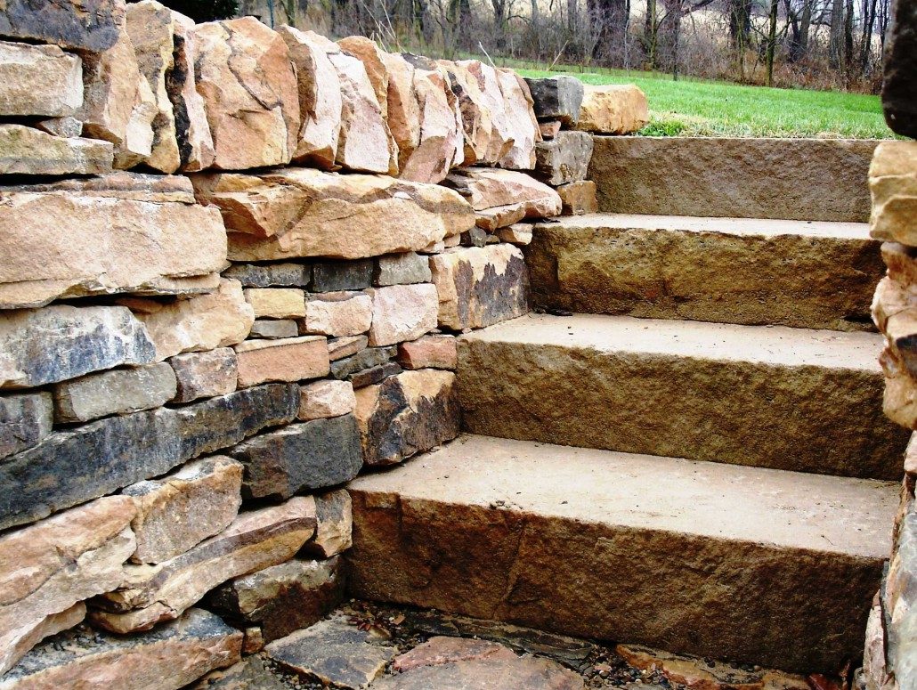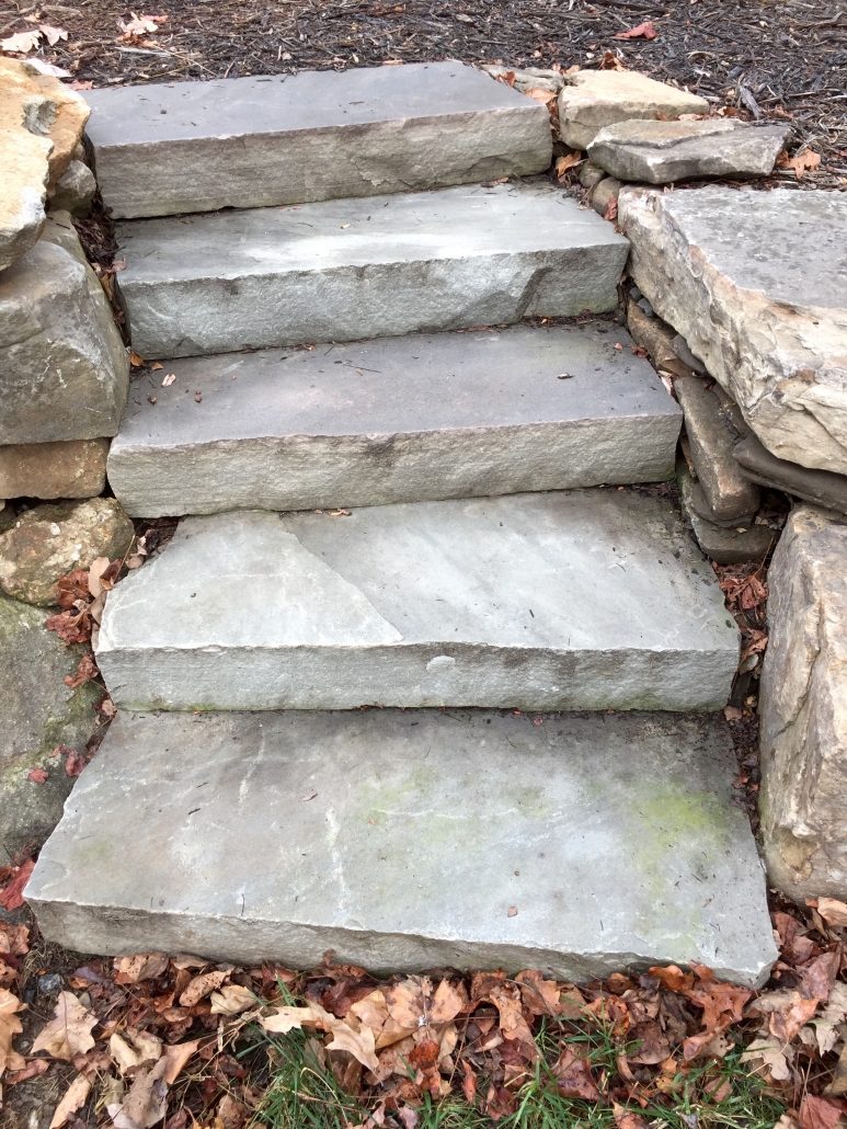 Stone steps work best as a single slab of stone, set so that the top surface is level in both directions. Stone steps last longer if they rest on top of the step beneath them, with a 3″ overhang. I set steps into a bed of crushed gravel, compacted.